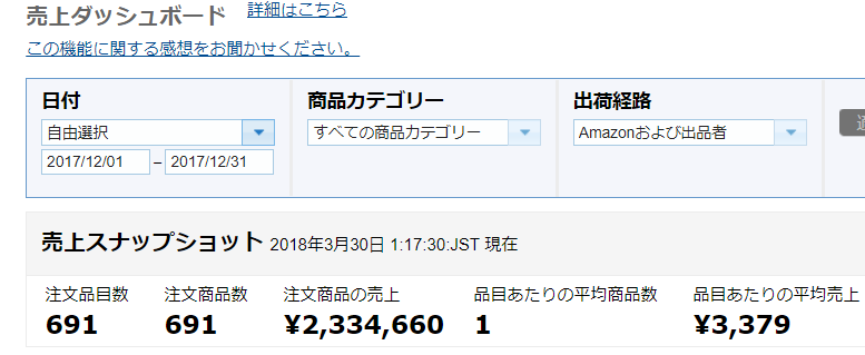 1ヵ月のAmazonの売上げ230万円です。