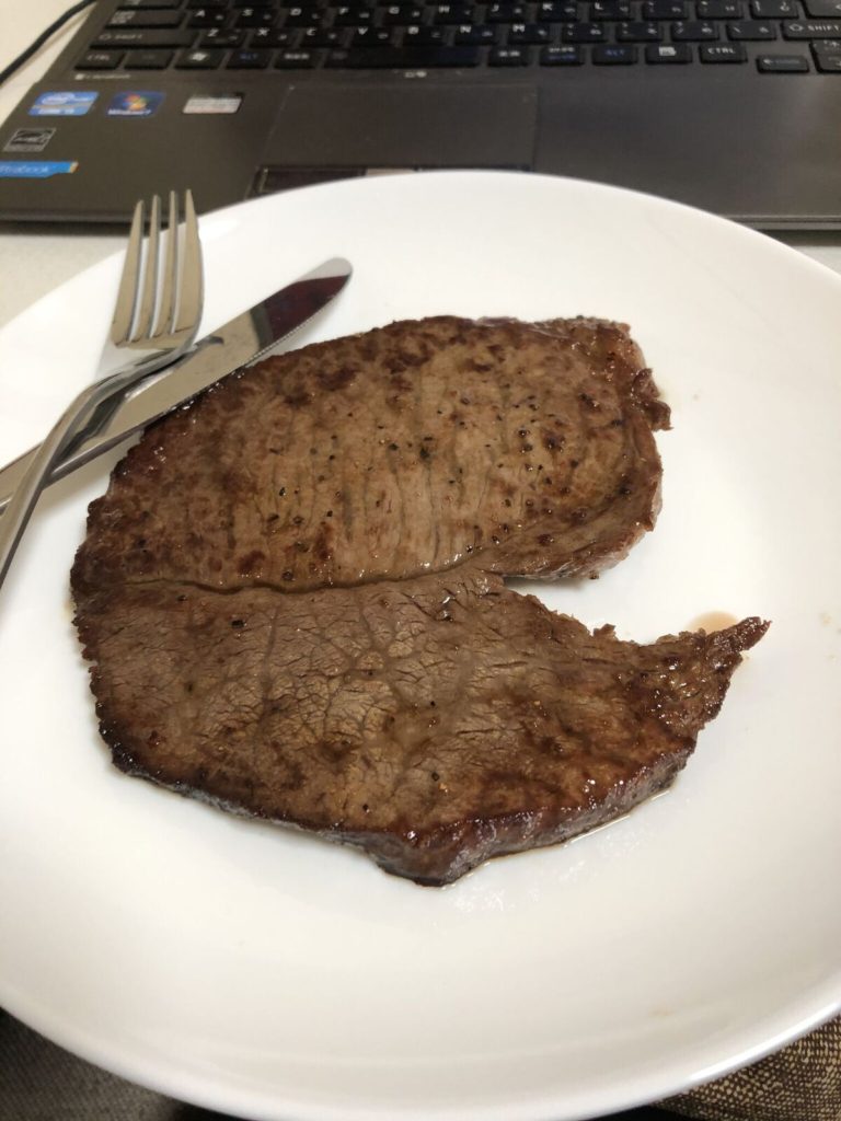 やはり牛肉。フライパンにオリーブオイルをしっかりとひいて、塩コショウ。今回にんにくを忘れたのが痛かったです。