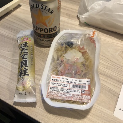 温泉に入って疲れをいやして、セイコーマートというコンビニで買ったホタテ貝柱かまぼこと焼きそばと北海道といえば札幌ビールを堪能しました。
