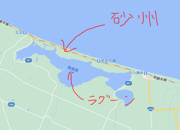 僕はこの涛沸湖とオホーツク海に挟まれた砂州の上を走っています。この涛沸湖は地理的にはラグーン(潟湖)になります。砂州というのは、海岸の砂が風や波で流されてきて堆積してできた地面になります。それに海がさえぎられてできた内海が潟湖です。秋田の八郎潟も潟湖です。