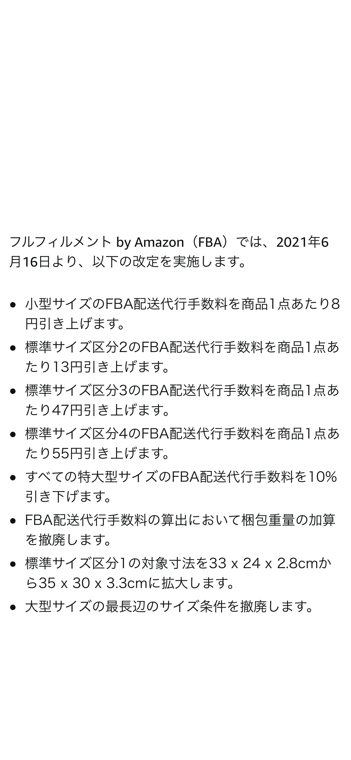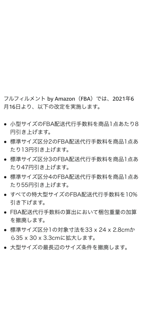 さて、表題の件なのですが、AmazonのFBA発送代行手数料が2021年6月16日から上がるようです。