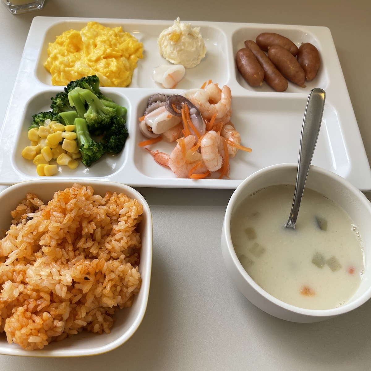 ここの朝食はこの海鮮レモンマリネが美味しいです。ご飯はピラフみたいに味が付いている。スムージーやコーヒーもコンビニのやつと同じで美味しい。