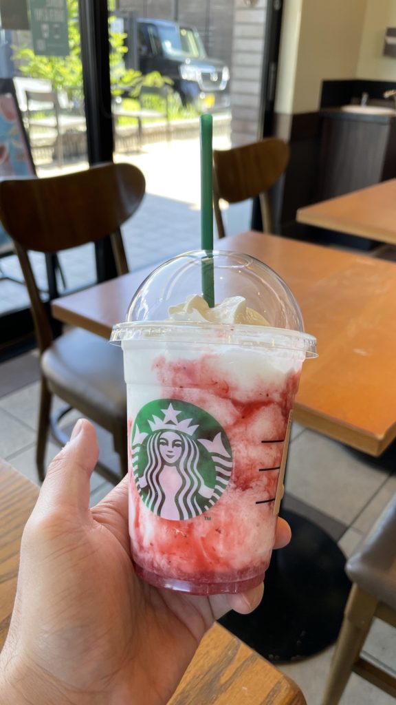 ここで自分の大好物のストロベリーフラペチーノを注文。夏を感じますね。