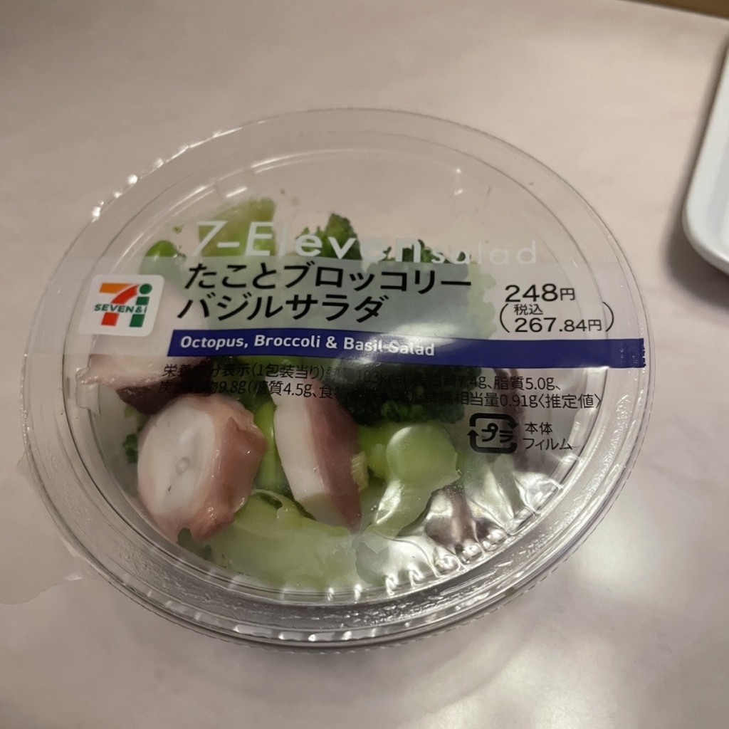 晩酌はセブンイレブンで買ったブロッコリーとバジルのサラダととみ田監修豚まぜソバ。